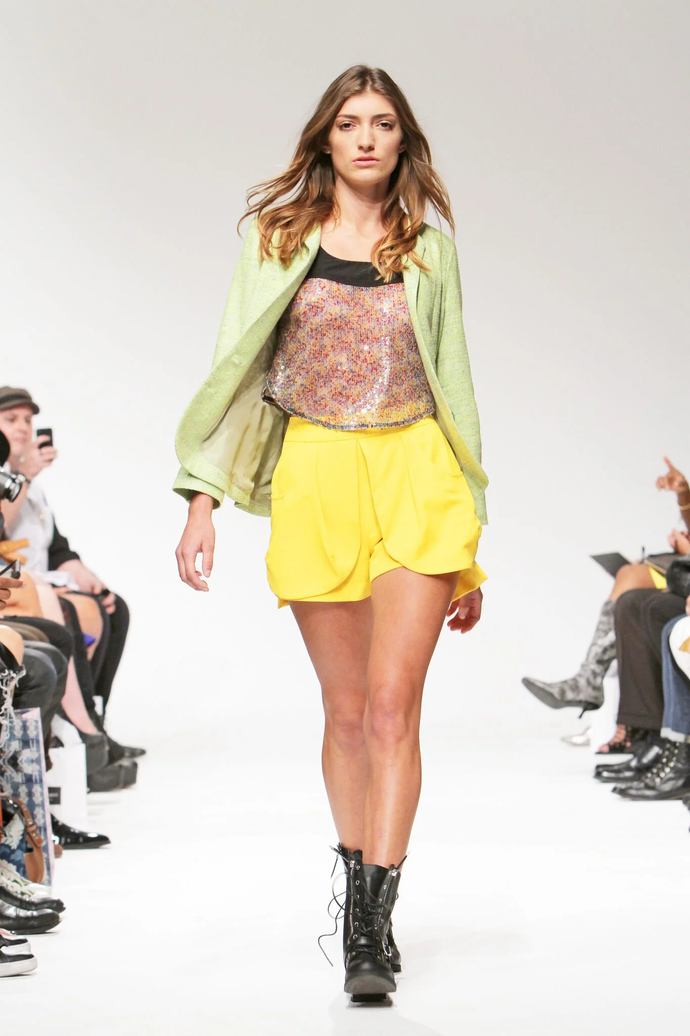 Feathers, leather and tailored piece suits live up to the fast and wild lifestyle of a rockstar's daughter. Textured knits with a 3D jacquard woven pattern add a subtle elegance, while the gold and silver metallic threads keep this collection fun.
